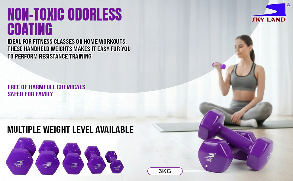 These SKY LAND vinyl dumbbells feature a specialized non-toxic and odorless coating that is free of harmful chemicals, making them a safer choice for family use. Designed for high-performance home workouts, the anti-roll hexagonal design ensures the weights stay securely in place during floor exercises while providing essential floor protection to prevent scratches on your indoor surfaces. Each dumbbell is built with a solid internal core and an ergonomic handle for a comfortable, non-slip grip, perfect for muscle building, toning, and resistance training. Available in multiple weight levels from 1kg to 5kg, this versatile set is an ideal home fitness starter for users of all levels.