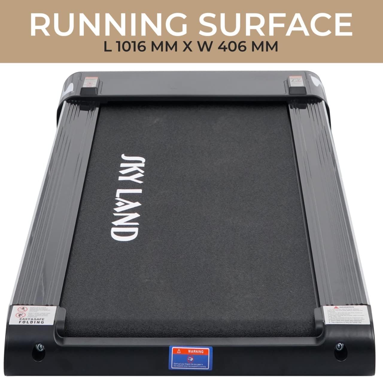 It has a 101.6 ?? 40.64 cm running belt with 5-layer non-slip texture, upgraded shock absorption, and a safety key for emergency stop.