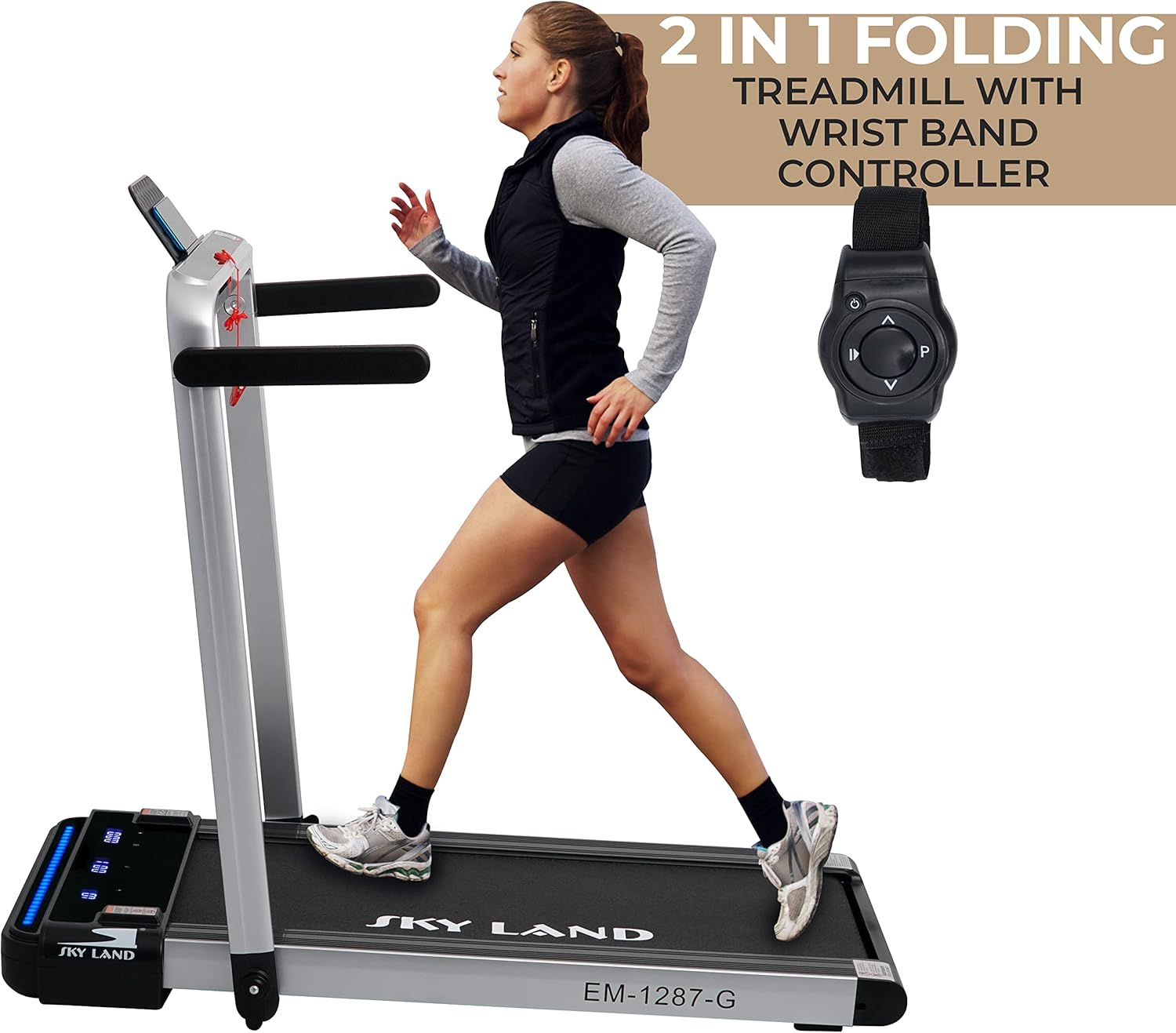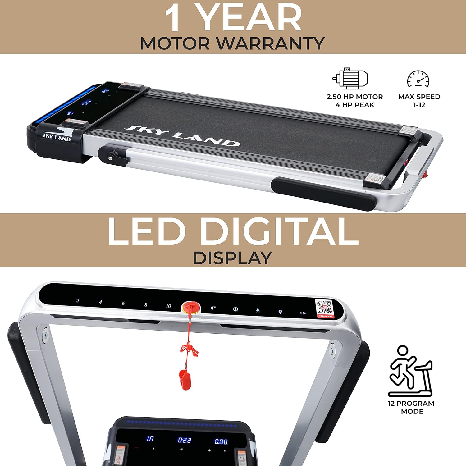 ? [Foldable Treadmill 2 in 1 Designed] The foldable treadmill for home has 12 preset programs with multi-workout modes. When the handrail is folded, it can be used as a desk walking machine at a speed of 1-6 km/h, simply for you to walk while working. When the handrail is raised, the running speed can reach 12 km/h.to meet your different training needs. The LED display shows time, speed, distance and calories in real time, and keeps track of movement data.