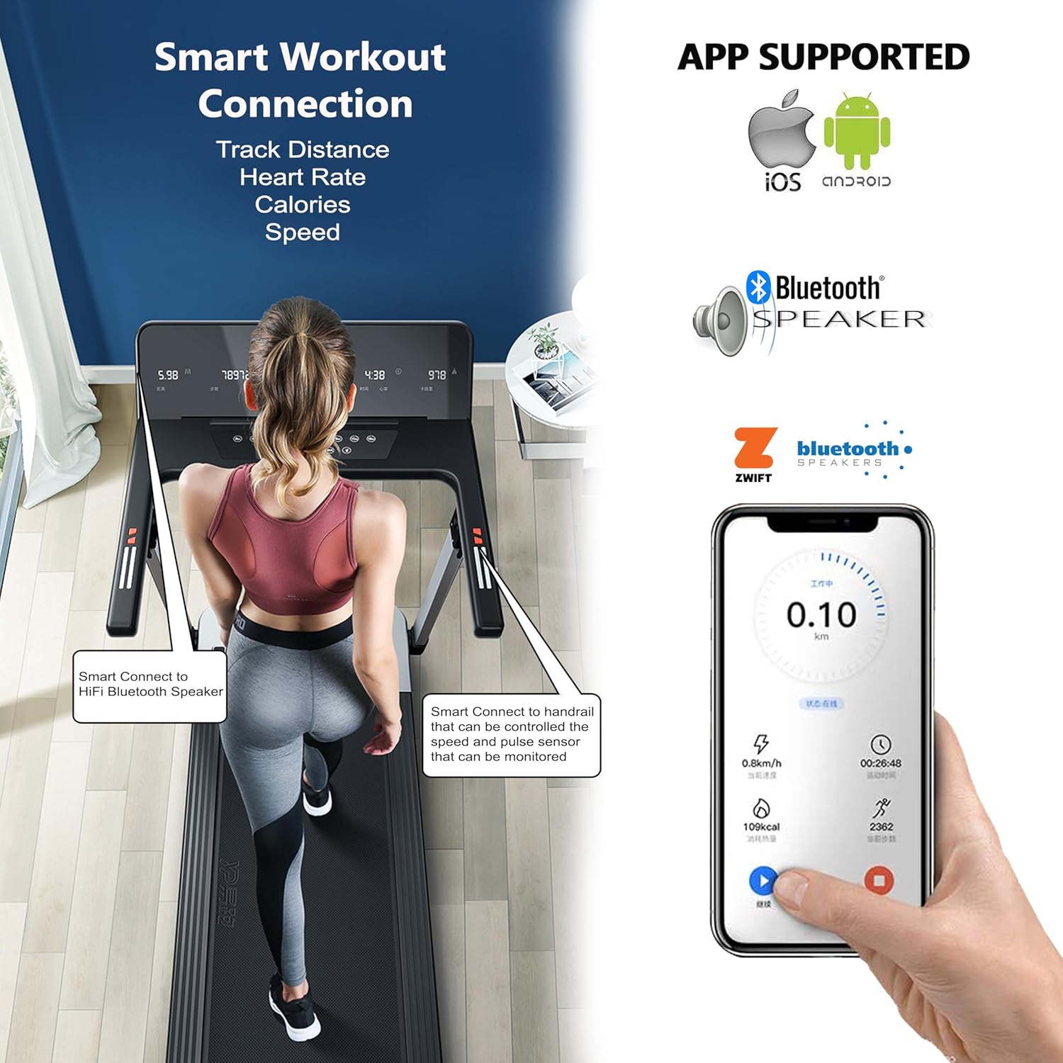 BLUETOOTH CONNECTIVITY & ZWIFT APP SUPPORT: Connect your treadmill to the ZWIFT fitness app via Bluetooth for interactive virtual workouts, tracking, and motivation from global running communities