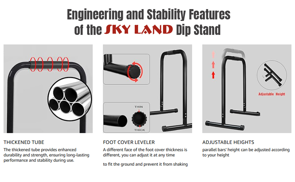 The SKY LAND Dip Stand is a professional-grade fitness tool designed for long-lasting performance and maximum safety. It features a thickened tube construction that provides enhanced durability and structural strength, ensuring a stable foundation during every repetition. To guarantee a wobble-free experience on any surface, the stand is equipped with a specialized foot cover leveler, allowing users to adjust the thickness to fit uneven ground and prevent shaking. This highly adaptable unit also includes adjustable height settings, enabling the parallel bars to be customized to the user’s specific height for optimal form. Whether you are performing dips, rows, or core work, this dip stand offers the stability and engineering required for a rigorous and effective home workout.