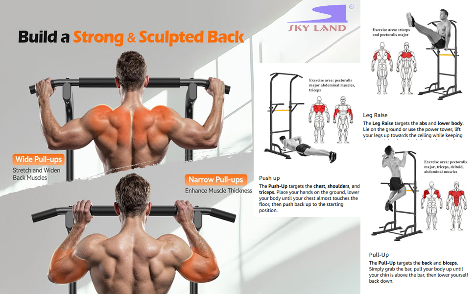 The SKY LAND Multi-Function Power Tower (EM-1841) is an elite home fitness solution designed to build a strong and sculpted upper body through high-impact bodyweight training. This versatile station allows users to perform wide-grip pull-ups to stretch and widen back muscles, as well as narrow-grip variations to enhance muscle thickness. Beyond back development, the tower features a dedicated pull-up station to target the biceps, a push-up area for the chest and shoulders, and a leg raise station specifically engineered to engage the abs and lower body. By offering a comprehensive range of movement—including dips for triceps and pectoralis major development—this power tower enables a full-body workout that builds lean muscle, boosts cardiovascular health, and improves overall flexibility from the convenience of your home.
