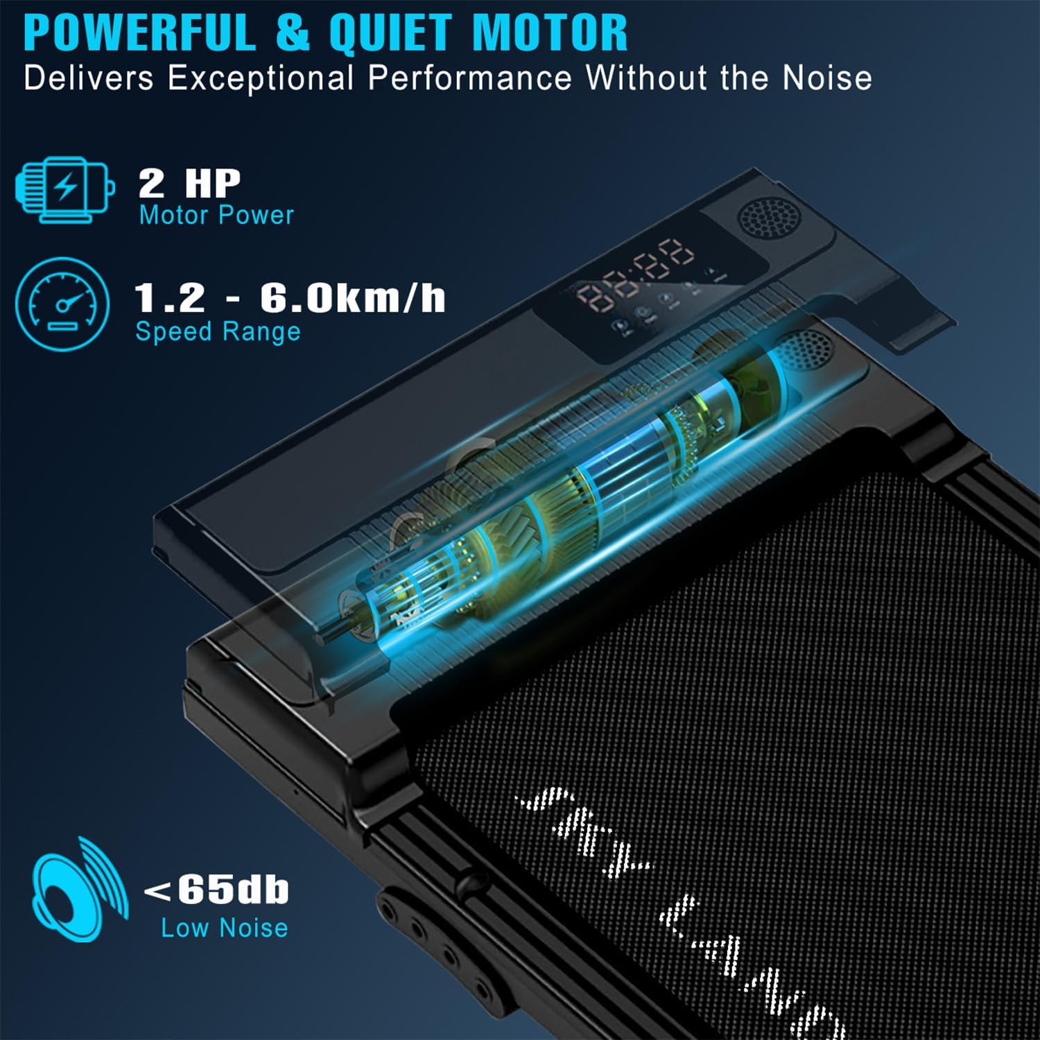 QUIET & POWERFUL 2HP MOTOR ?C Equipped with a 1.5HP continuous (2.0HP peak) motor, supporting speeds up to 6 KM/H. Smooth, low-noise operation lets you walk or jog without disturbing family or coworkers.