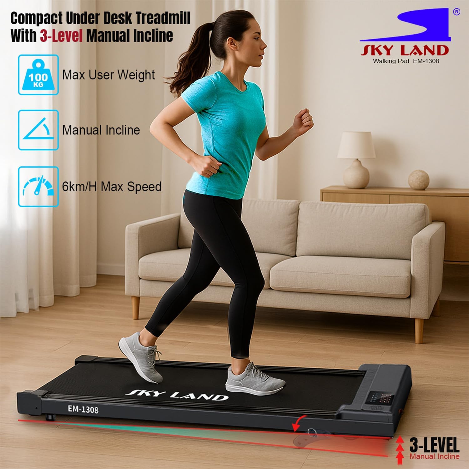 Walking Pad Treadmill, Slim Under Desk Treadmill for Home & Office | Compact, Portable, Quiet 2HP Motor, 3-Level Incline, LED Display, Remote Control, 6 Km/h, 100Kg Capacity EM-1308